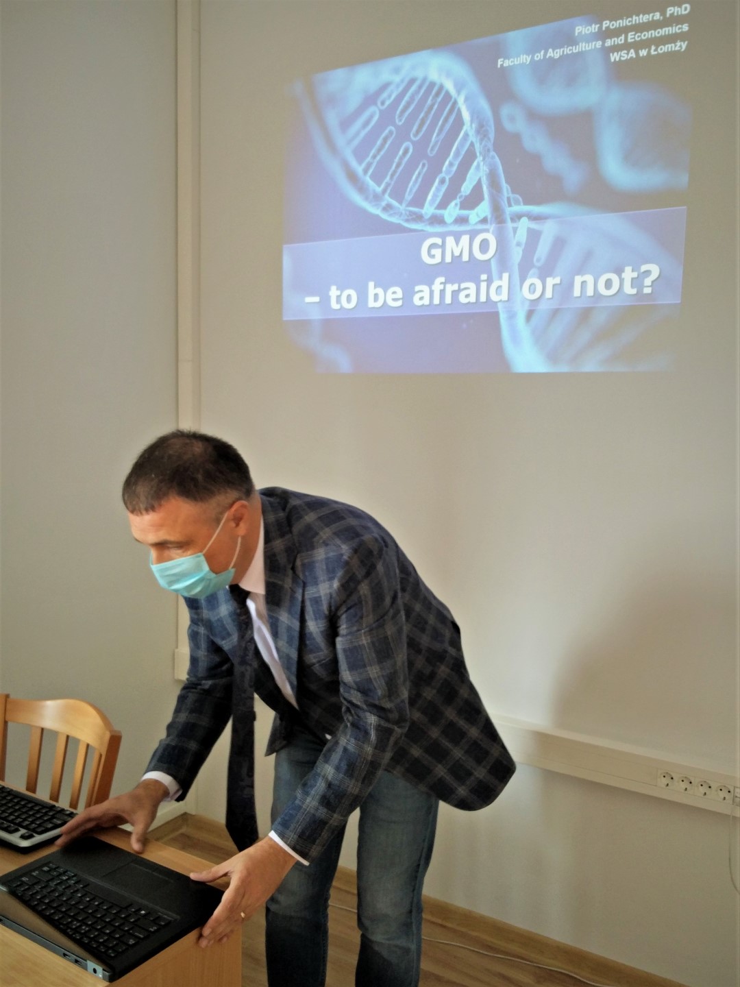 Dekanas dr. Piotr Ponichtera maisto technologijos studijų programos studentus sudomino savo paskaita apie GMO, pateikdamas klausimą, ar turime bijoti genetiškai modifikuotų organizmų. Išryškindamas GMO privalumus ir trūkumus, paliko galimybę studentams į klausimą atsakyti patiems.