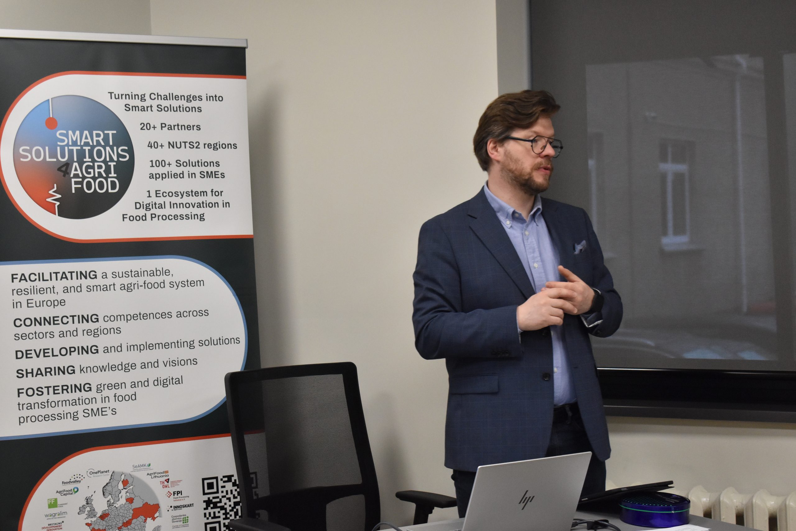 Agrotechnologijų fakulteto projektų vadovas Marius Ignatonis ir prodekanė dr. Erika Kubilienė pristatė Vilniaus kolegiją, vykdomas studijų kryptis ir Fakultete atliekamus taikomuosius mokslinius tyrimus, dominančius bendrosios mokslinių tyrimų ir inovacijų programos „Europos horizontas“ kvietimus ir pakvietė konsorciumo partnerius prisijungti prie pradinių idėjų EH mokslo projektų (Research Innovation Action ) paraiškoms rengti.