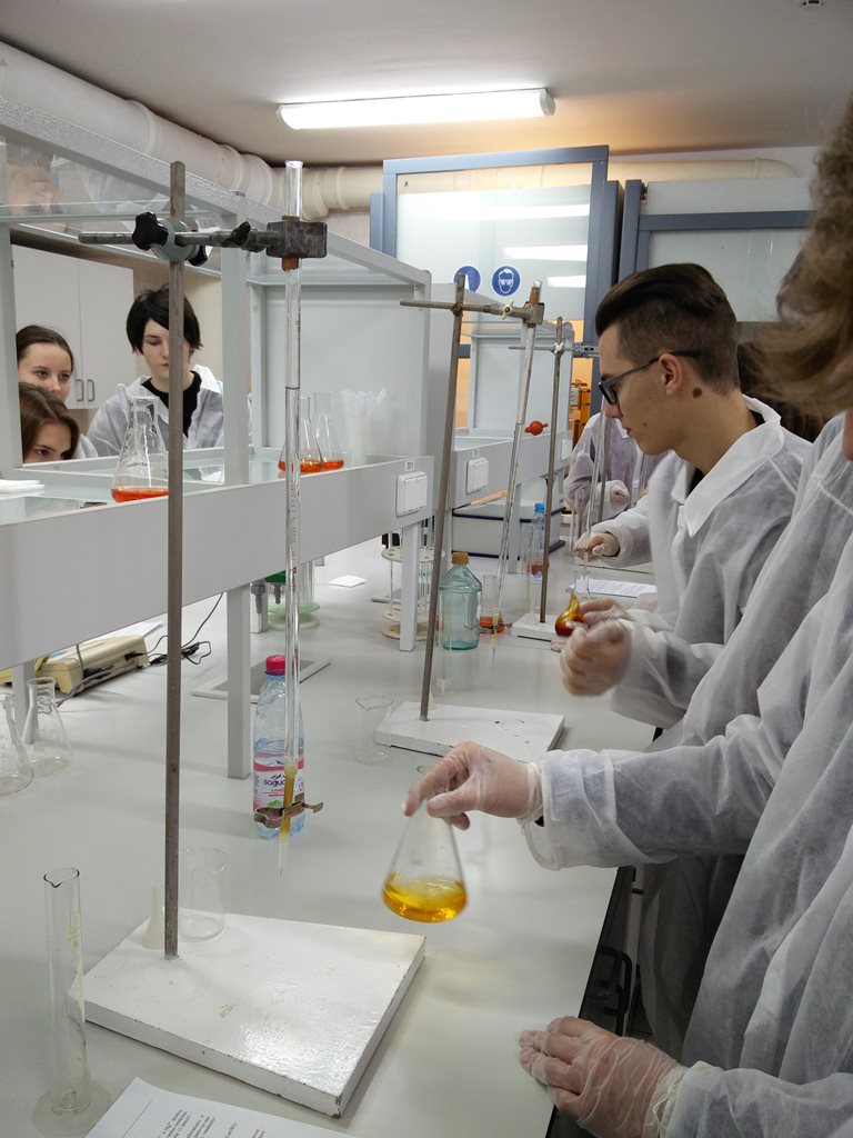Moksleiviai susidomėję išklausė informaciją apie studijų organizavimą Vilniaus kolegijoje, studijų programos Cheminė analizė struktūrą, jos įgyvendinimą, Studentų mokslinės draugijos veiklą bei įsidarbinimo galimybes. Po trumpo saugaus darbo reikalavimų aptarimo Chemijos katedros lektorė D. Židonytė pristatė teorinį titrimetrijos kursą, supažindino su medžiagomis ir naudojamomis priemonėmis, aptarė praktinio darbo „Vandens kietumo nustatymas“ eigą. Moksleiviai, vadovaujami lektorės D. Židonytės konduktometru išmatavo vandens savitąjį elektrinį laidį (SEL), nustatė laikiną vandens kietumą acidimetriniu metodu, titruodami stiklinėmis biuretėmis bei kompleksonometrijos metodu, titruodami skaitmeninėmis biuretėmis. Darbo pabaigoje apskaičiavo bei aptarė gautus rezultatus.