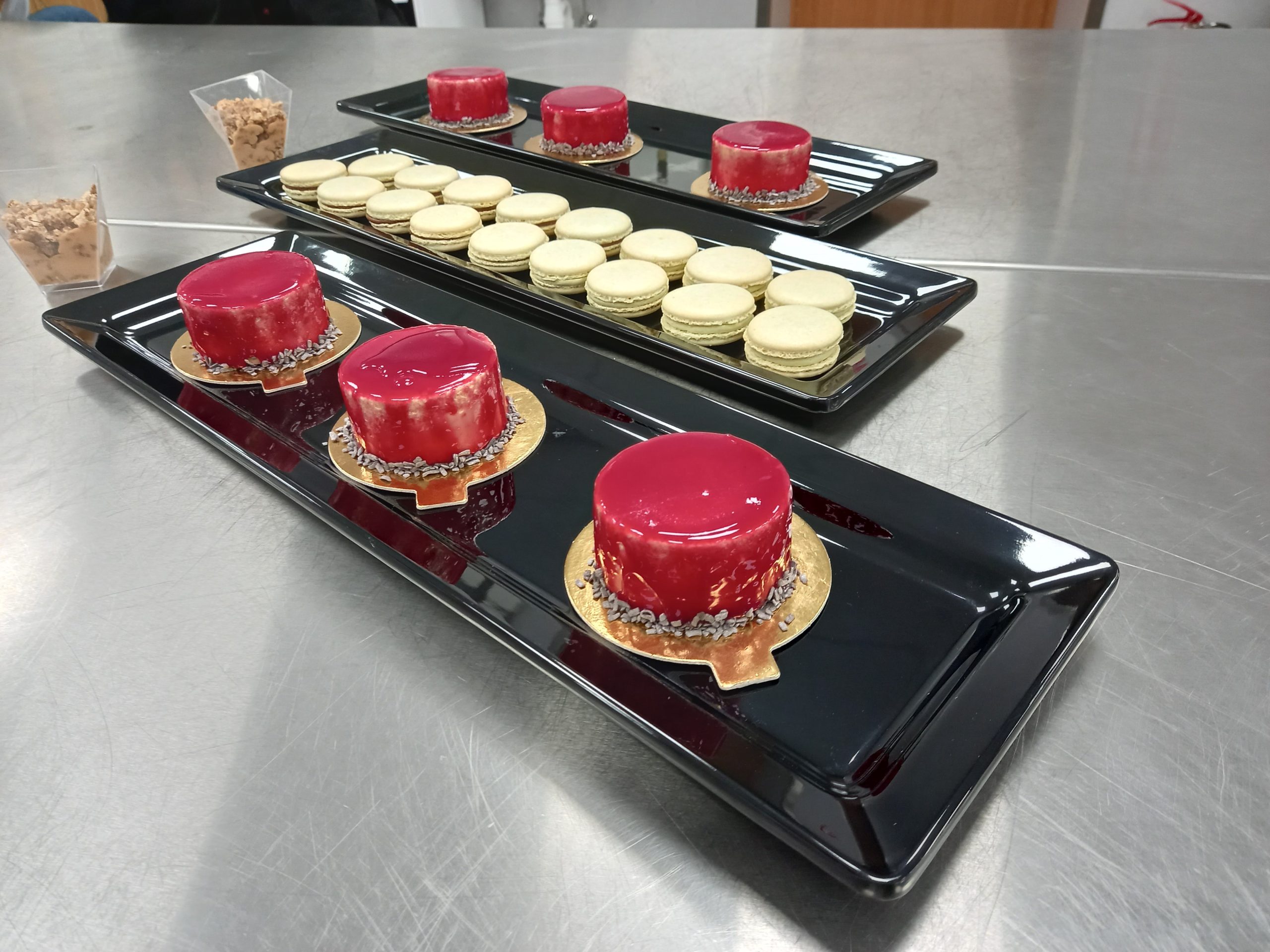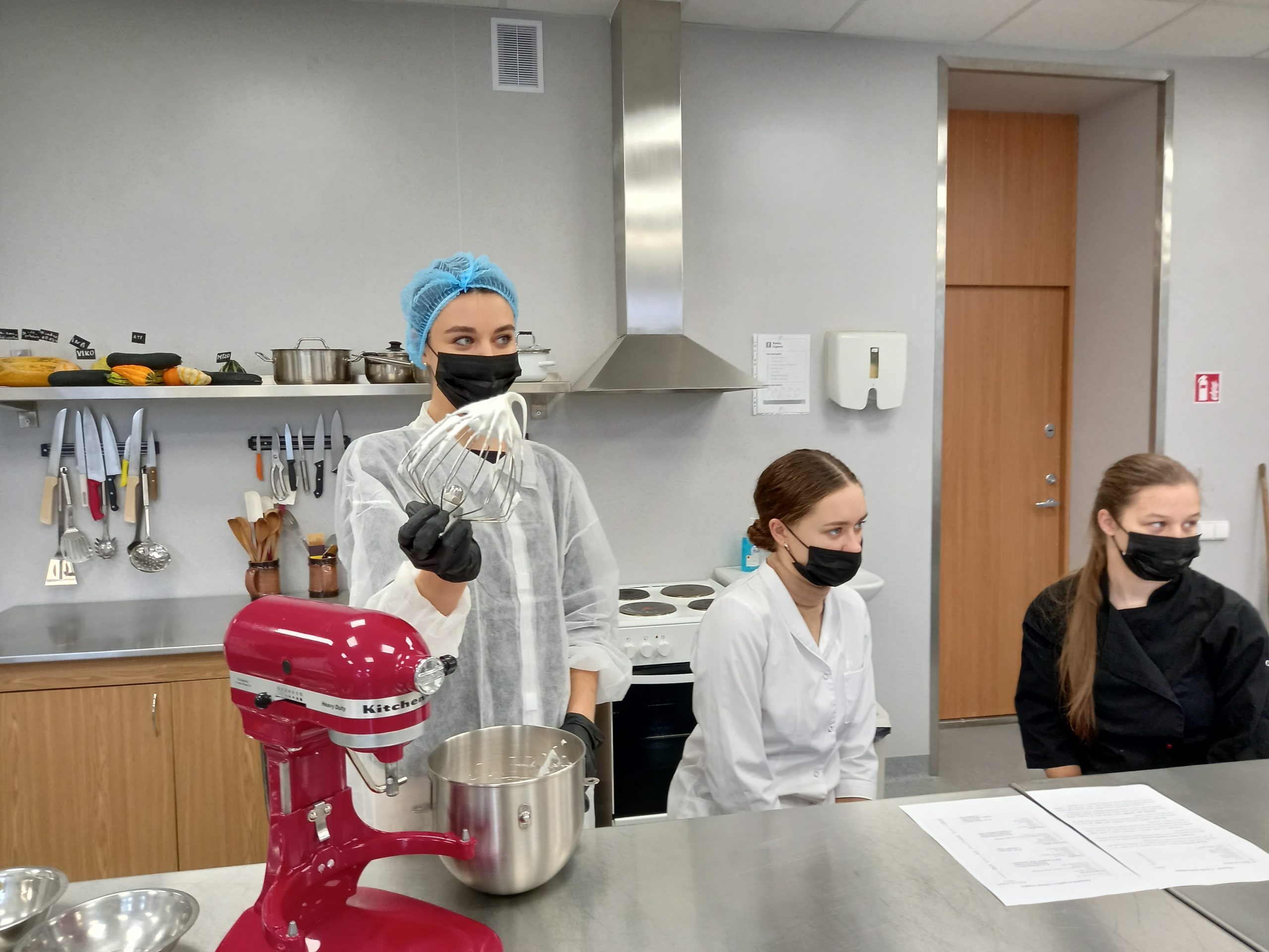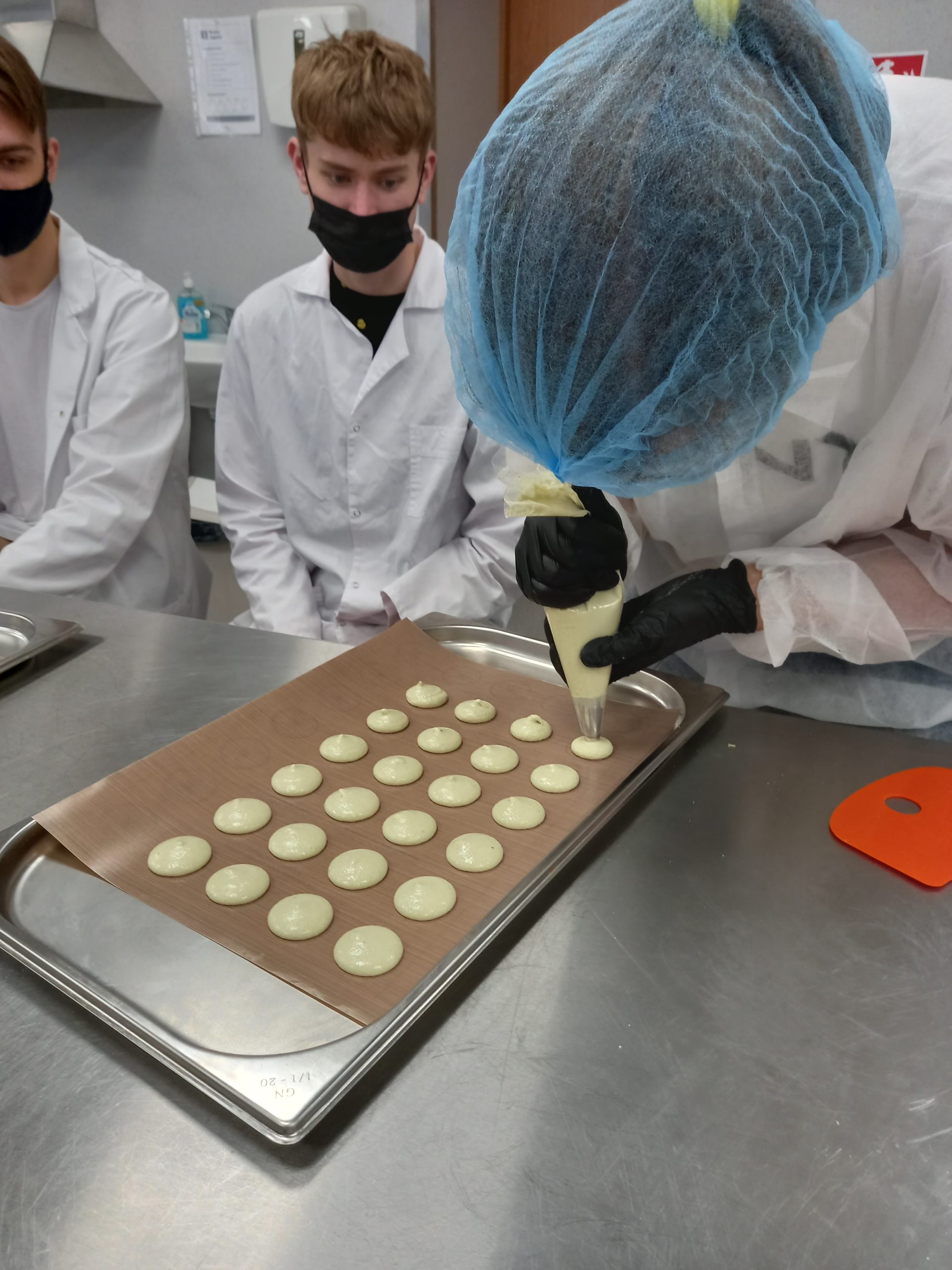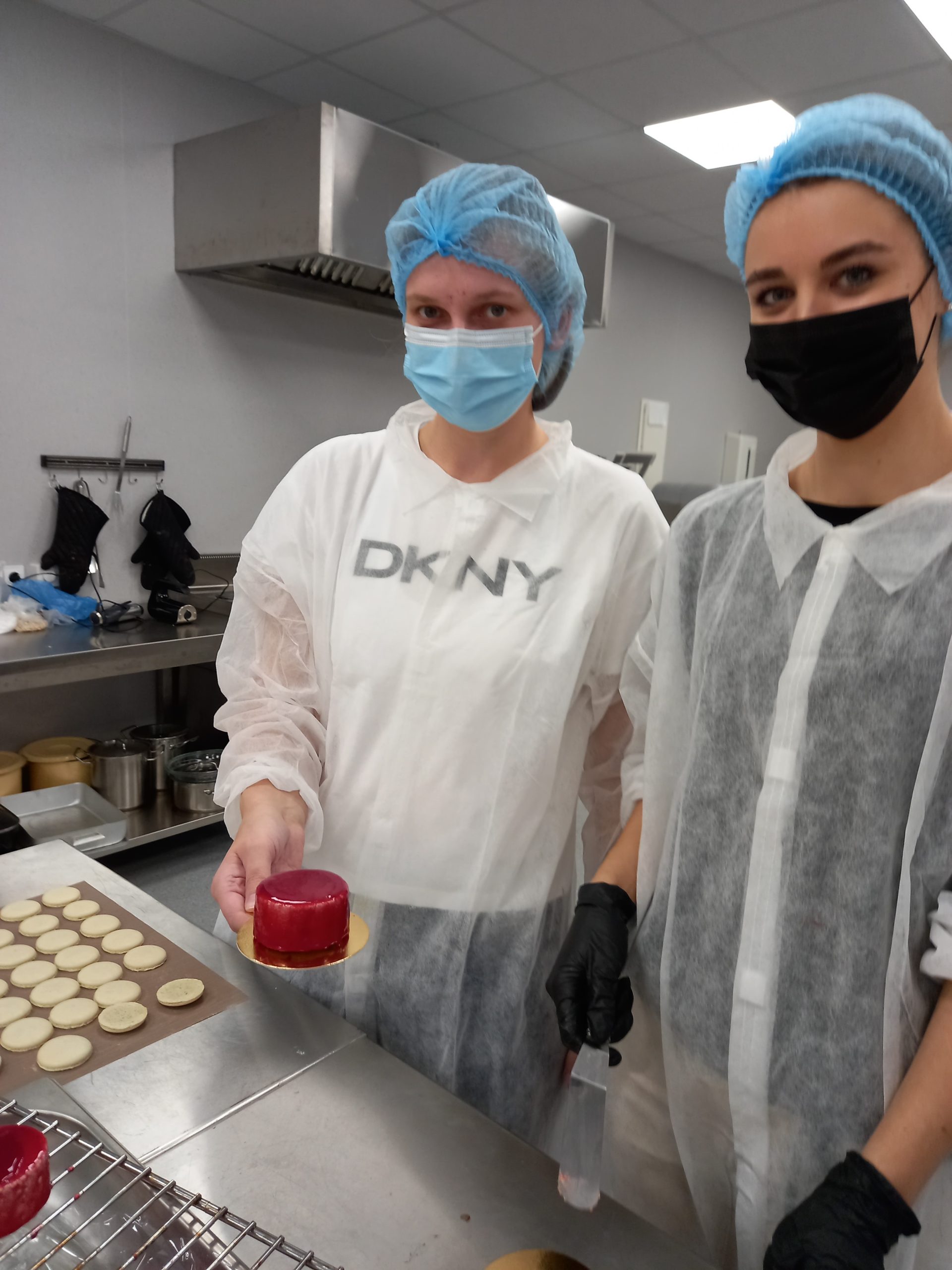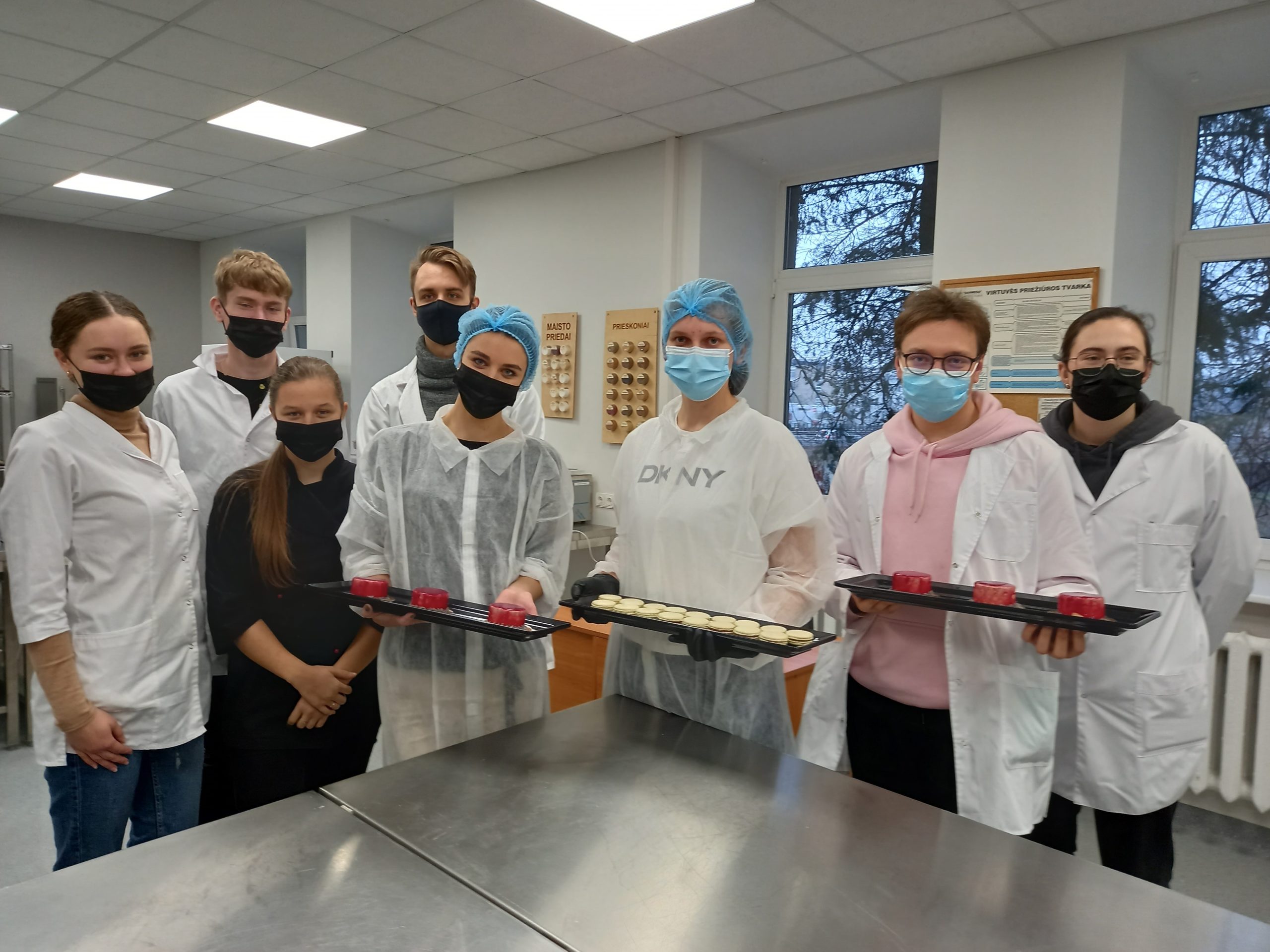 Lapkričio 11 d. Maisto technologijos studijų programą baigusios absolventės Laura Naumovaitė ir Justina Kuznecova studentams vedė praktinį užsiėmimą „Prancūziškų desertų gamyba“. Užsiėmimo metu absolventės demonstravo prancūziškų „Putėsinių pyragaičių“ ir „Macarons“ sausainių gamybos procesą. Šie kepiniai buvo jų diplominiai darbai. „Putėsinių pyragaičių“ gamybos procesas ilgesnis ir sudėtingesnis, apima tokias technologines operacijas kaip: biskvito paruošimas, vyšnių tyrės paruošimas, putėsių paruošimas, suformuotų pyragaičių pusgaminių šaldymas -400C temperatūroje, sušaldytų pyragaičių paviršiaus apliejimas (dekoravimas). „Macarons“ sausainių gamyboje svarbus momentas – tešlos konsistencijos užtikrinimas ir suformuotų sausainių pusgaminių formoje „daužymas-kratymas“, siekiant pašalinti pusgaminiuose oro daleles. Absolventės ne tik demonstravo technologinį gamybos procesą, nurodė technologinius parametrus, bet ir uždavė studentams klausimus, susijusius su technologiniais parametrais.