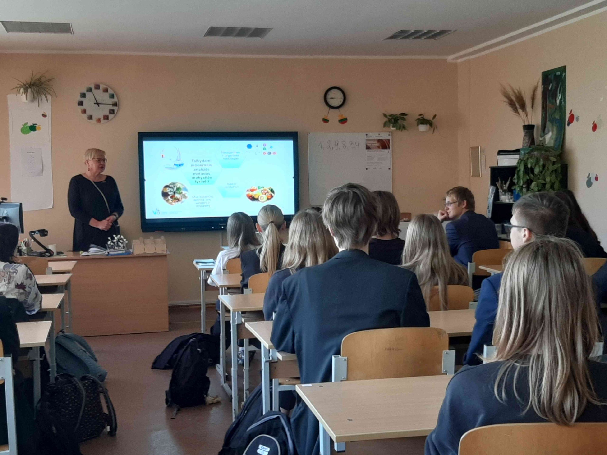 Dėstytoja Irena supažindino moksleivius su studijų programa Cheminė analizė bei kitomis Agrotechnologijų fakultete vykdomomis studijų programomis, aptarė studijuojamus dalykus, praktikas ir karjeros galimybes.