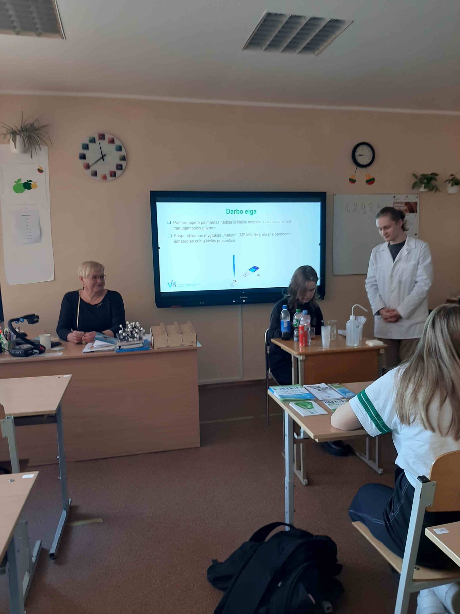 Moksleiviai, vadovaujami dėstytojos Jolantos ir studento Dainoto, konduktometru nustatė bendrą mineralizaciją įvairiuose vandens mėginiuose, o refraktometru išmatavo cukraus kiekį įvairiuose gaiviuosiuose gėrimuose.