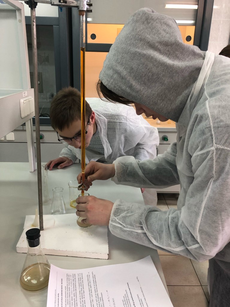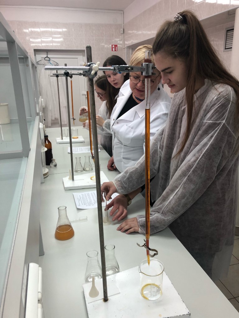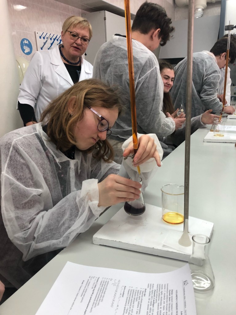 Dėstytoja I. Čerčikienė paaiškino moksleiviams titrimetrijos metodo esmę, supažindino su praktikumo „Jodometrija. Vitamino C nustatymas vaisių sultyse“ naudojamomis medžiagomis ir aptarė jo eigą. Moksleiviai, susipažinę su darbo metodika, vadovaujami dėstytojų Irenos ir Jolantos bei laborantės Viktorijos įvairių vaisių sultyse nustatė vitamino C kiekį ir apskaičiavo bei aptarė rezultatus.