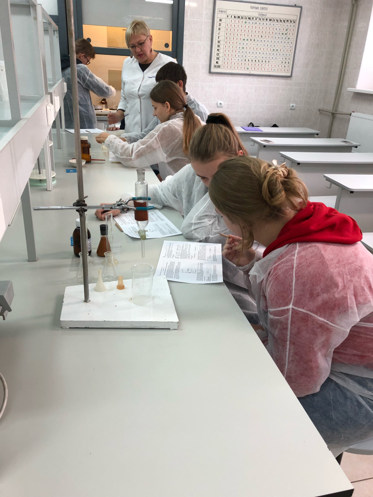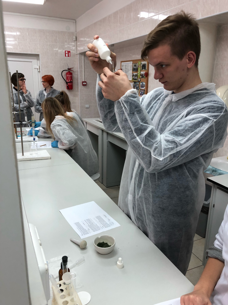 Vadovaujami dėstytojos Irenos Čerčikienės ir laborantės Viktorijos Gončar Chemijos laboratorijoje moksleiviai atliko praktikumą „Organinių ir neorganinių junginių išskyrimas ir gryninimas”. Soksleto aparatu gamino citrininės katžolės ekstraktą, sublimavo jodą, išbandė jo tirpumą įvairiuose tirpikliuose, iš kavos sublimavimo būdu išskirtus kofeino kristalus stebėjo pro mikroskopą. Iš morkų sulčių ekstrahavo karotiną bei tirpius aliejuje A ir D vitaminus. Etanoliu iš dilgėlių ekstrahavo chlorofilą, atskyrė žalios spalvos pigmentą chlorofilą nuo geltonos spalvos – ksantofilo. Adsorbcine aliuminio oksido kolonėle atskyrė spalvotus jonus. Kiekviena moksleivių grupė aptarė ir pristatė bandymų rezultatus.