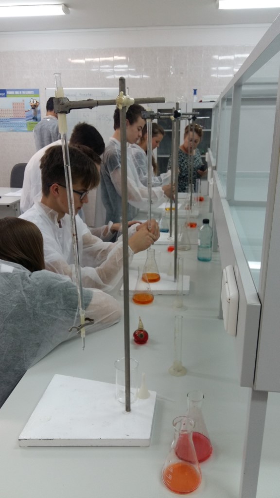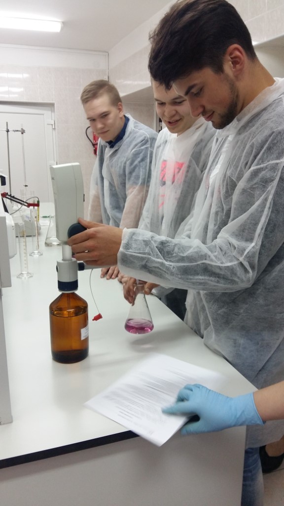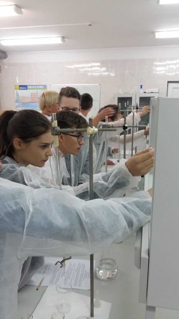 Chemijos katedros vedėja I. Čerčikienė pristatė vandens kietumo teorinį kursą, supažindino su vandens kietumo nustatymo būdais, medžiagomis ir naudojamomis priemonėmis, aptarė praktikumo „Vandens kietumo nustatymas titrimetriniu ir elektrometriniu metodais“ eigą. Moksleiviai, vadovaujami chemikės inžinierės J. Jurkevičiūtės, dėstytojos Irenos ir laborantės Karolinos konduktometru išmatavo savitąjį elektrinį laidį (SEL), nustatė laikinąjį vandens kietumą acidimetriniu metodu, titruodami stiklinėmis biuretėmis bei bendrąjį vandens kietumą kompleksonometrijos metodu, titruodami skaitmeninėmis biuretėmis. Darbo pabaigoje apskaičiavo bei aptarė gautus rezultatus.