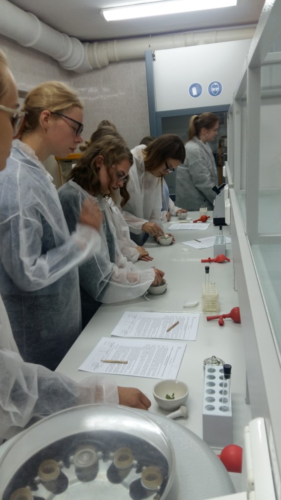 Chemijos katedros lektorė D. Židonytė su moksleiviais nagrinėjo spektrometrinių analizės metodų pritaikomumą ir galimybes. Dėstytoja aptarė šiuolaikinius instrumentinius tyrimo metodus, gilinosi į spektrofotometrinę analizę. Laboratorijoje moksleiviai, vadovaujami dėstytojos ir laborantės Viktorijos, atliko eksperimentinį laboratorinį darbą „Chlorofilo (a, b) ir bendros karotinoidų koncentracijos nustatymas augalinėje žaliavoje“. Moksleiviai pagal metodiką iš įvairių prieskoninių žolelių pasiruošė spiritinius ekstraktus, paruošė mėginius, kuriuose spektrofotometru nustatė mėginio šviesos sugertį, apskaičiavo chlorofilo (a, b) bei bendrą karotinoidų koncentracijas ir aptarė rezultatus.