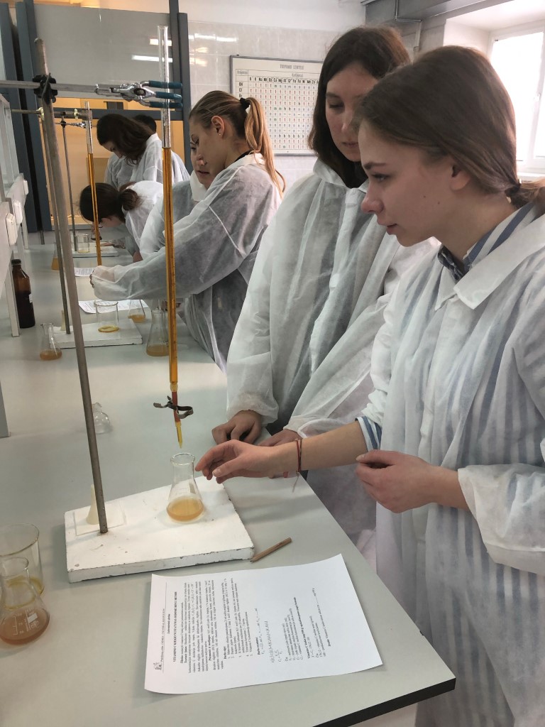 Su titrimetrijos metodu ir praktikume „Jodometrija. Vitamino C nustatymas vaisių sultyse“ naudojamomis medžiagomis moksleivius supažindino dėstytoja Dalė Židonytė. Susipažinę su darbo metodika moksleiviai, vadovaujami dėstytojos Dalės ir laborantės Viktorijos, įvairių vaisių sultyse nustatė vitamino C kiekį ir apskaičiavo bei aptarė rezultatus.