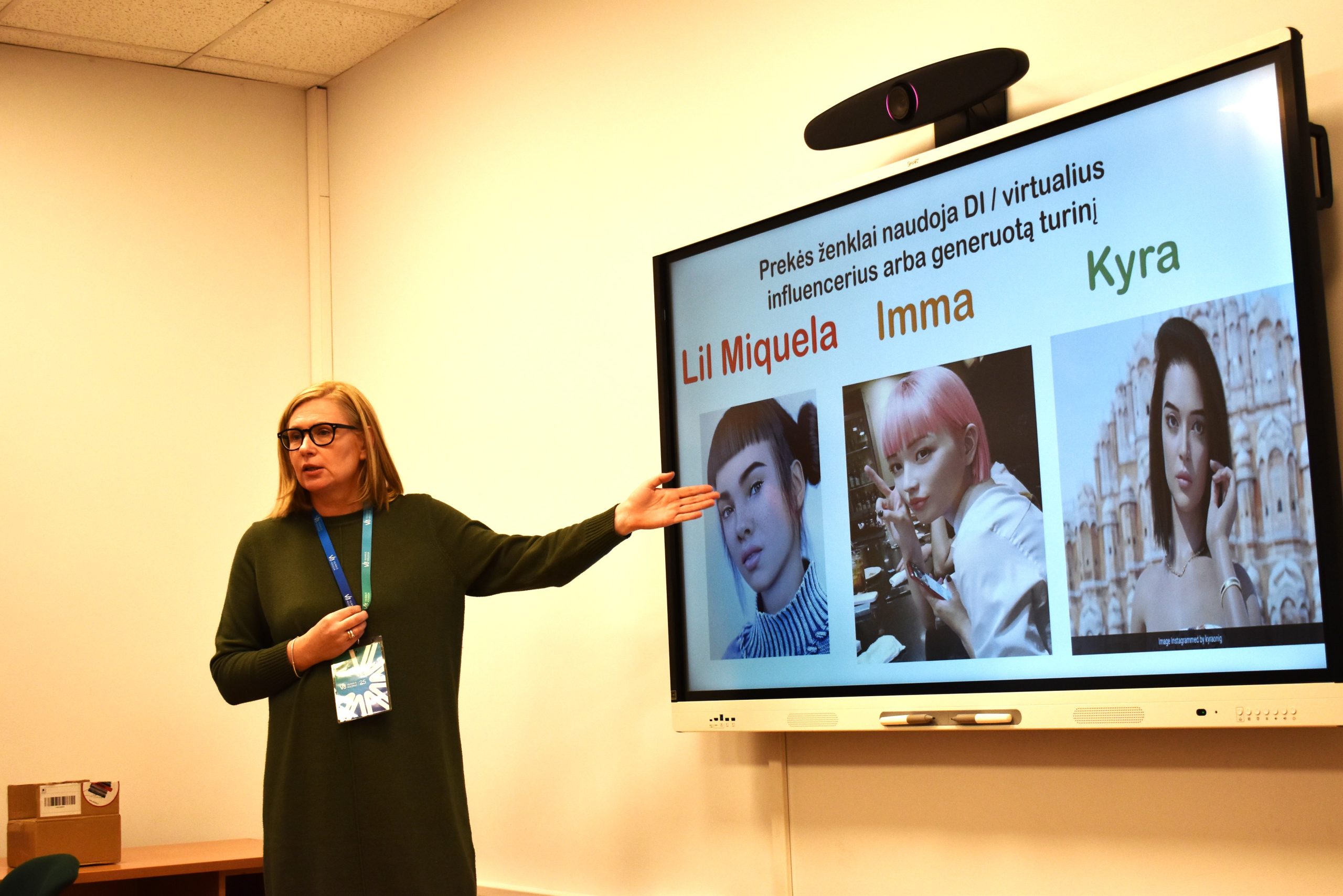 Užsiėmimo metu su moksleiviais aptarta, kaip DI įrankiai keičia rinkodaros procesus, leidžia kurti personalizuotas reklamos kampanijas, automatizuoti komunikacijos sprendimus ir analizuoti vartotojų elgseną. Lektorė pristatė konkrečių pavyzdžių, kaip DI generuojamas turinys padeda efektyviau pasiekti tikslines auditorijas, tačiau kartu pabrėžė ir su tuo susijusias etines dilemas: skaidrumo būtinybę, informacijos tikrumo iššūkius, atsakomybę už generuojamą turinį bei riziką manipuliuoti vartotojų pasirinkimais.