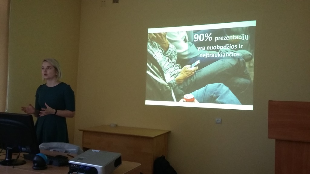 30200 tradicinių PowerPoint‘o skaidrių – tiek pasaulyje sukuriama kiekvieną sekundę. Kur rasti idėjų, kaip sutvarkyti informaciją, kaip sukurti įspūdingą pristatymą? Visą tai spalio 26 dieną Barclay Operacijų Centro lektorė Akvilė Kniukštaitė pristatė Vilniaus kolegijos Agrotechnologijų fakulteto Kraštovaizdžio dizaino studijų programos studentams skaitydama paskaitą “How to build a good presentation”.