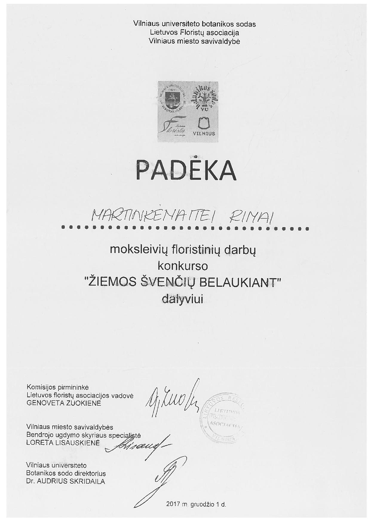 ZDI15 gr. studentė R. Martinkėnaitė varžėsi profesinių mokyklų moksleivių bei kolegijų studentų amžiaus grupėje ir komisijos vertinimui pateikė vieną paruoštą namų darbą – koliažą ir vietoje sukūrė konkursinį darbą pagal pateiktą užduotį, t.y. adventinį vainiką. VU botanikos sodas ir Lietuvos floristų asociacija Rimą Martinkėnaitę apdovanojo padėkos diplomu.