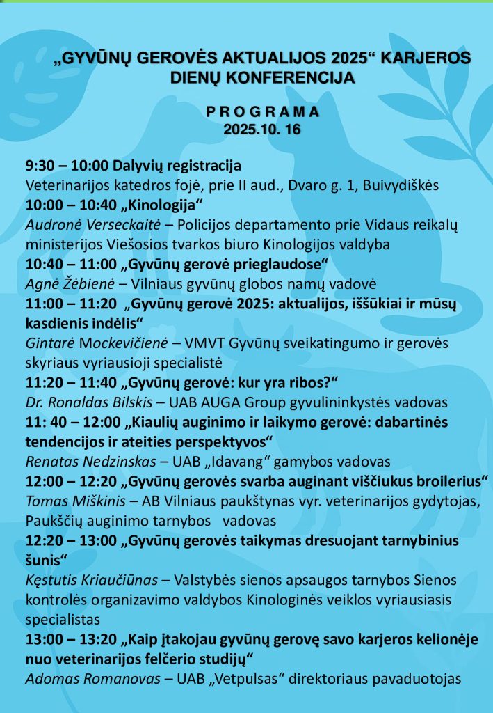 2025 spalio 16 d. 9:30 val.  Agrotechnologijų fakulteto Veterinarijos katedroje (Dvaro g.1, Buivydiškės, Vilniaus raj.) vyks Karjeros dienų konferencija  „Gyvūnų gerovės aktualijos 2025“.