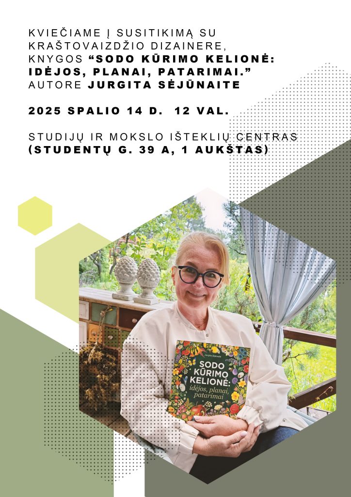 2025 m. spalio 14 d. 12 val. Studijų ir mokslo išteklių centre (Studentų g. 39A, I aukštas) vyks susitikimas su kraštovaizdžio dizainere, Kraštovaizdžio dizaino studijų programos absolvente ir knygos “Sodo kūrimo kelionė: idėjos, planai, patarimai” autore Jurgita Sėjūnaite.