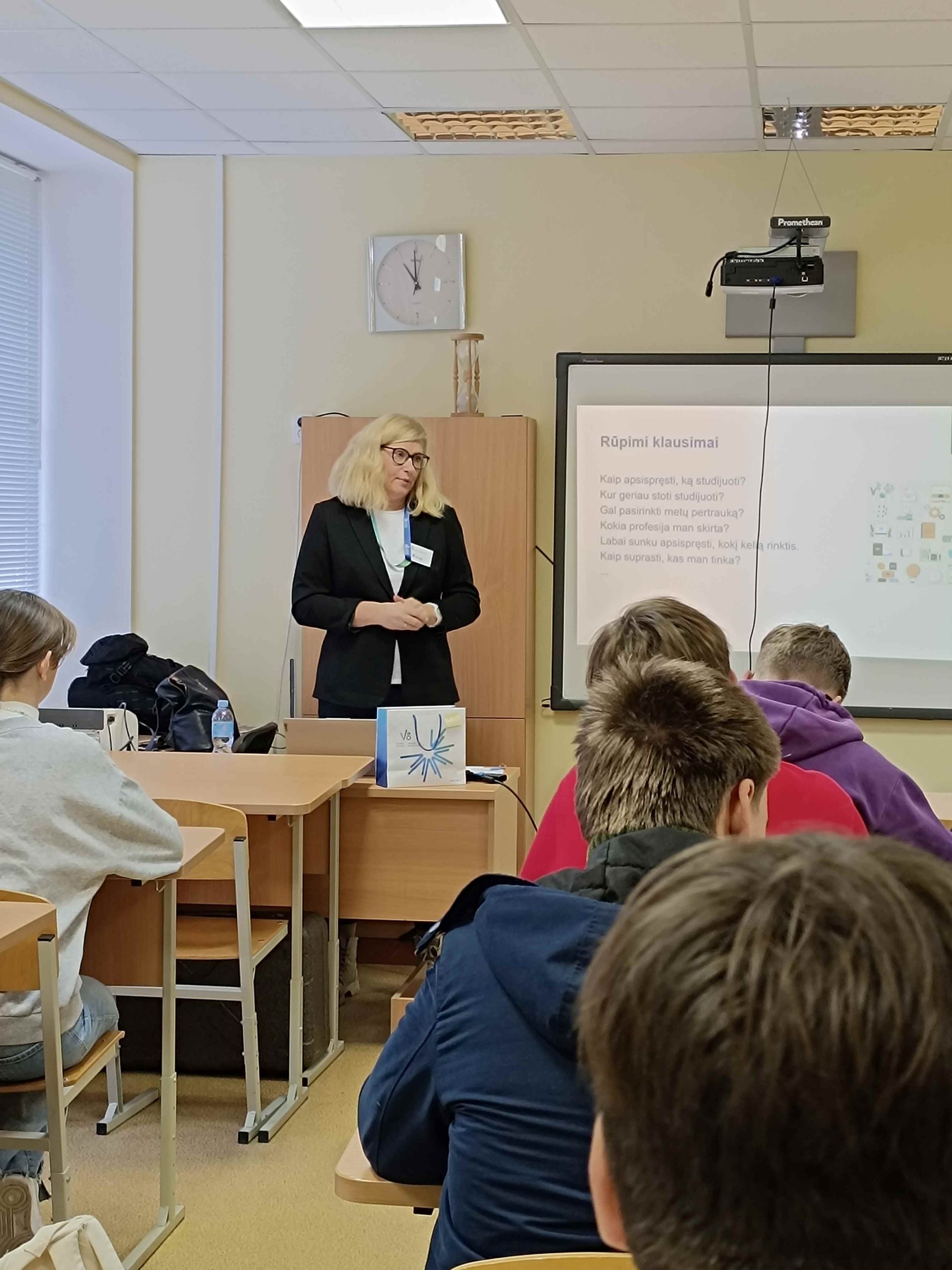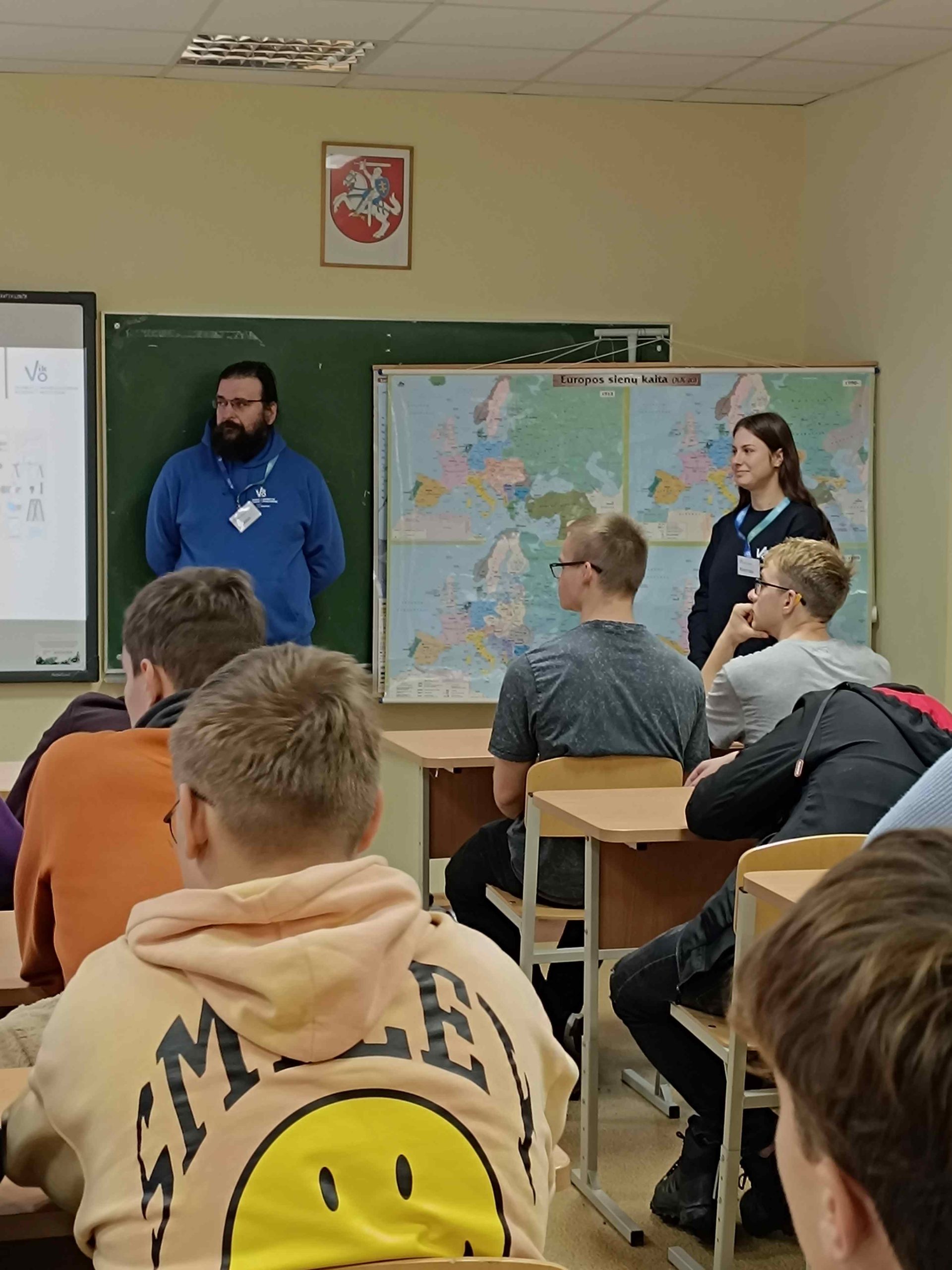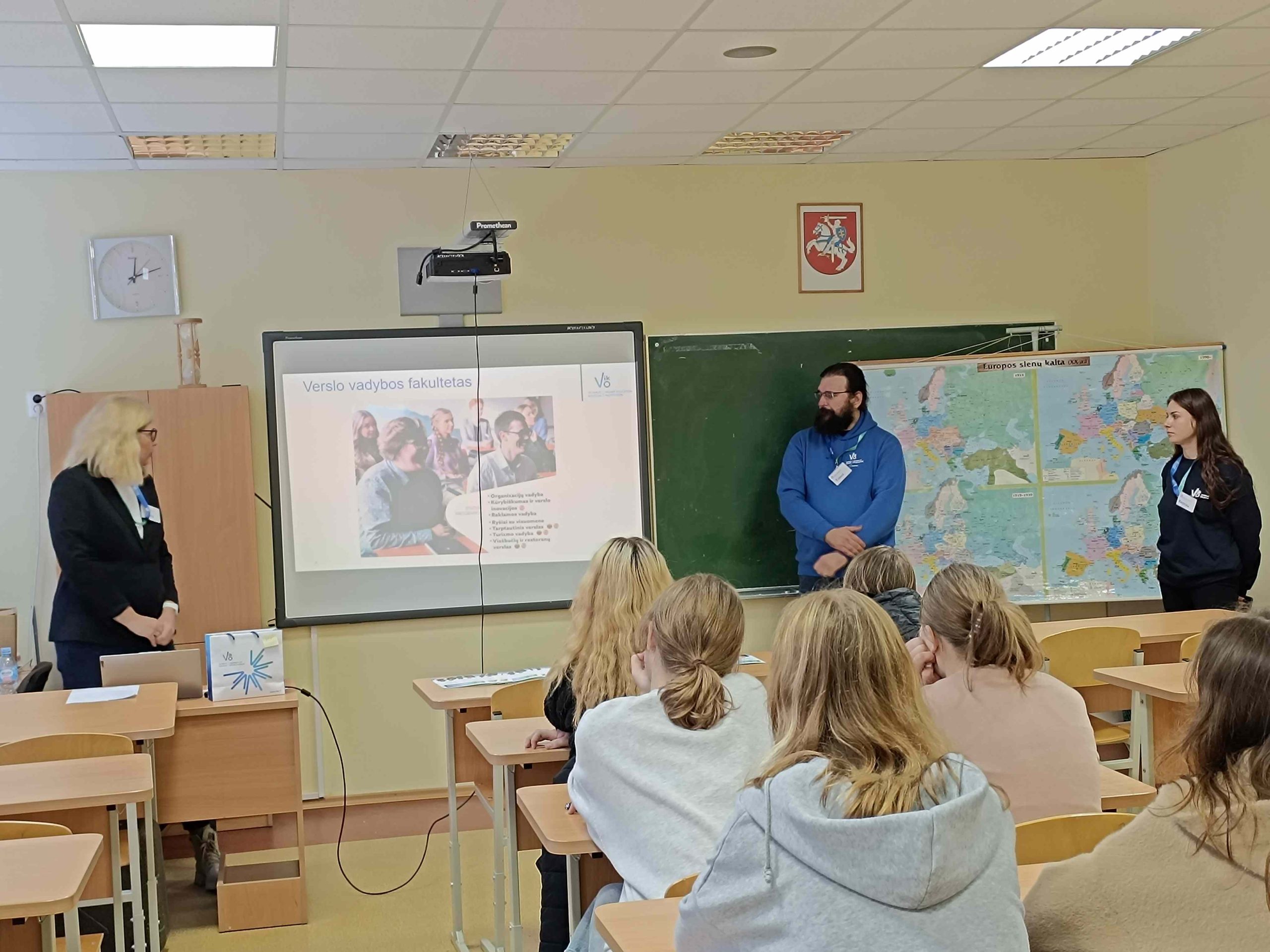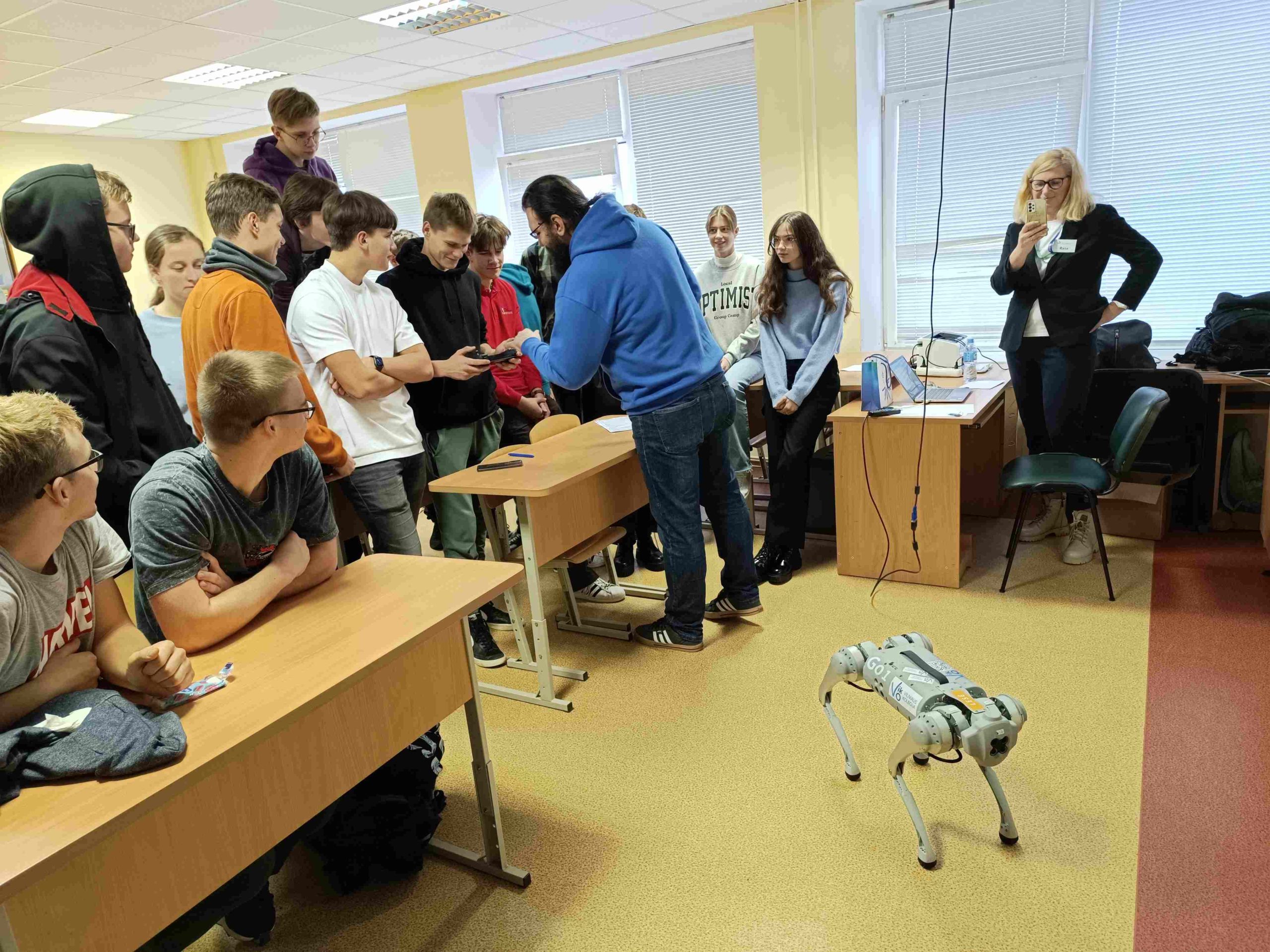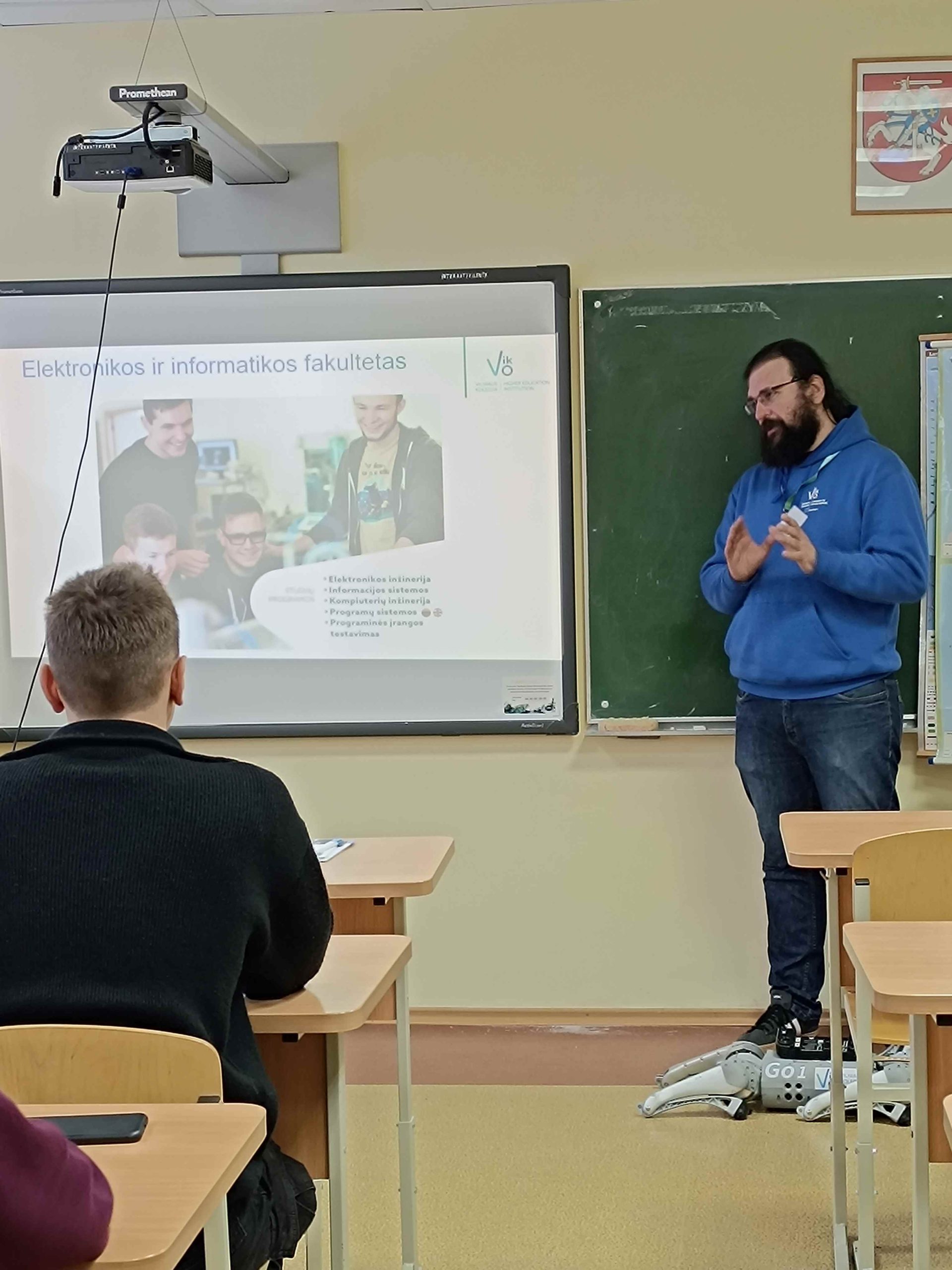 2023 m. spalio 27 d. Vilniaus kolegijos Agrotechnologijų fakulteto lektorė Rasa Miakinkovienė, Elektronikos ir informatikos fakulteto lektorius Tomas Kasperavičius bei veterinarijos studijų programos studentės Inga ir Kristina Lazdijų Motiejaus Gustaičio gimnazijos 9-11 klasių moksleiviams vedė paskaitas. Moksleiviams buvo pristatytos Vilniaus kolegijoje vykdomos studijų programos, jie buvo supažindinti su stojimo į kolegiją sąlygomis, studijų įdomybėmis. Moksleiviai buvo ypač sužavėti svečių atsivežta mokymo priemone – šuniu – robotu. Visiems norėjosi išbandyti jį valdyti. Gimnazijos moksleiviai buvo pakviesti dalyvauti Vilniaus kolegijos atvirų durų dienos renginiuose.