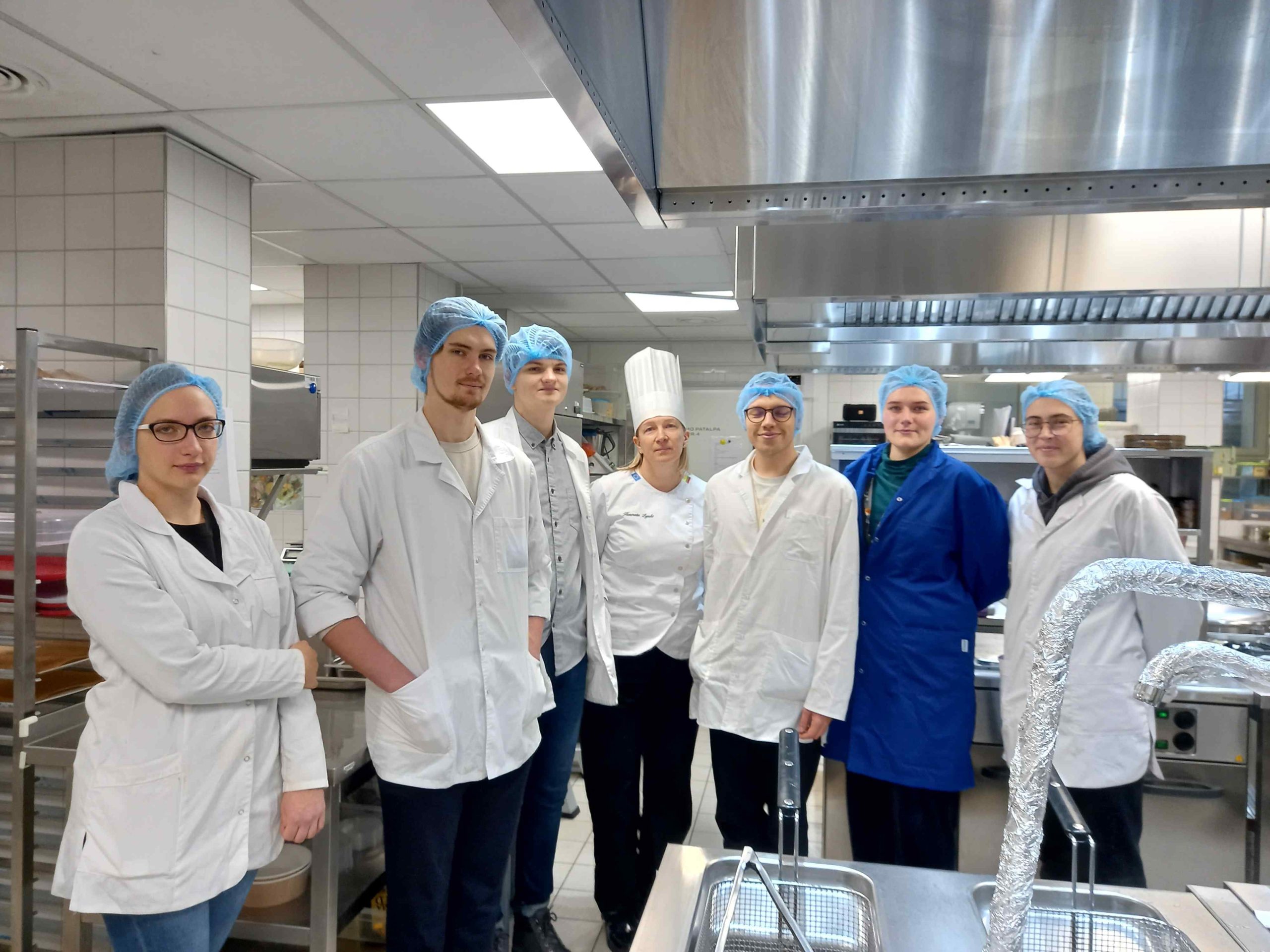 Spalio 26 d. Maisto technologijos studentai su dėstytoja J. Lazdauskiene lankėsi restorano “Neringa” gamybinėje bazėje. Maisto technologijos studijų krypties komiteto narė, restorano gamybos vadovė H. Lyndo parodė, kaip vyksta gamybos procesas nuo žaliavos iki patiekalų patiekimo klientui. Restorano asortimentas platus. Lankytojams siūlomi pusryčių, pietų, vakarienės, šventiniai patiekalai ir desertai. Studentai turėjo galimybę stebėti gamybos procesą nuo žaliavos priėmimo, laikymo, paruošimo iki patiekalo patiekimo klientui. Studentai susipažino, kaip keliauja pusgaminių, pagamintų patiekalų srautai, sužinojo, kaip išvengti kryžminės taršos. Studentai pamatė, kad restorano gamybiniai įrenginiai (šokofrosteris, sultinių virimo katilas, kočiojimo mašina), yra pritaikyti nedidelėms gamybinėms patalpoms, paliekant vietos judėti darbuotojams. Gamybos vadovė supažindino studentus su žaliavos laikymo žurnalais, žaliavų, pusgaminių ženklinimo reikalavimais, naujų patiekalų kūrimo etapais.
