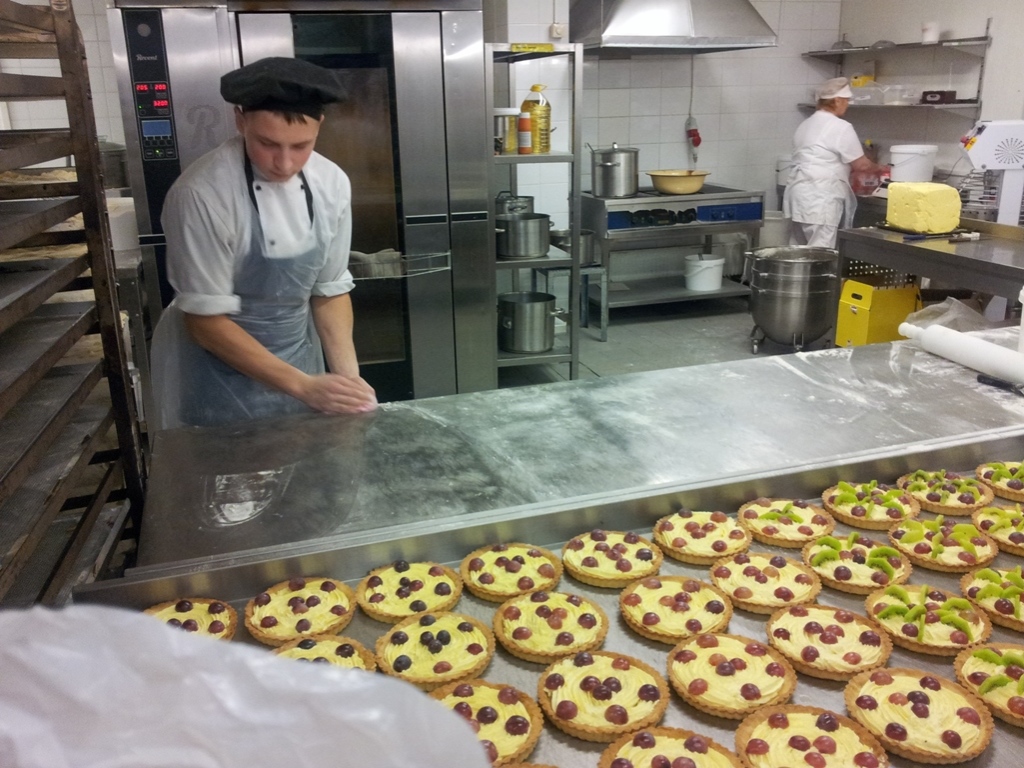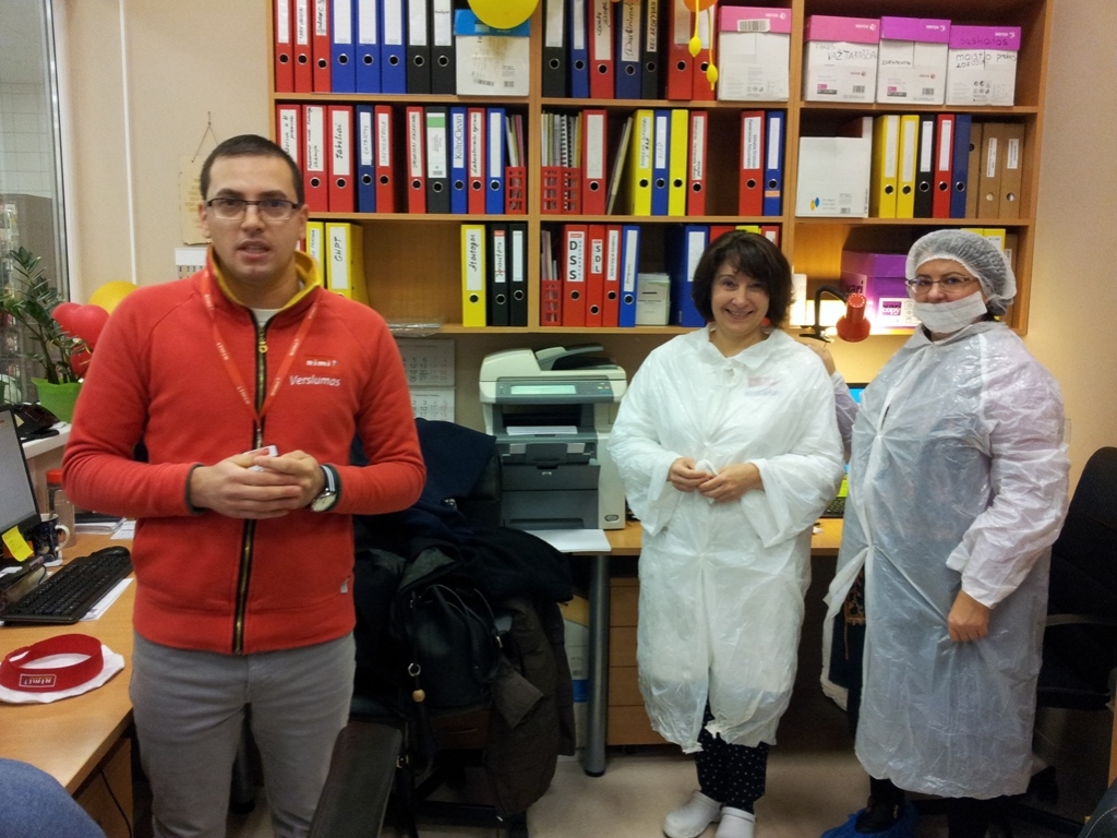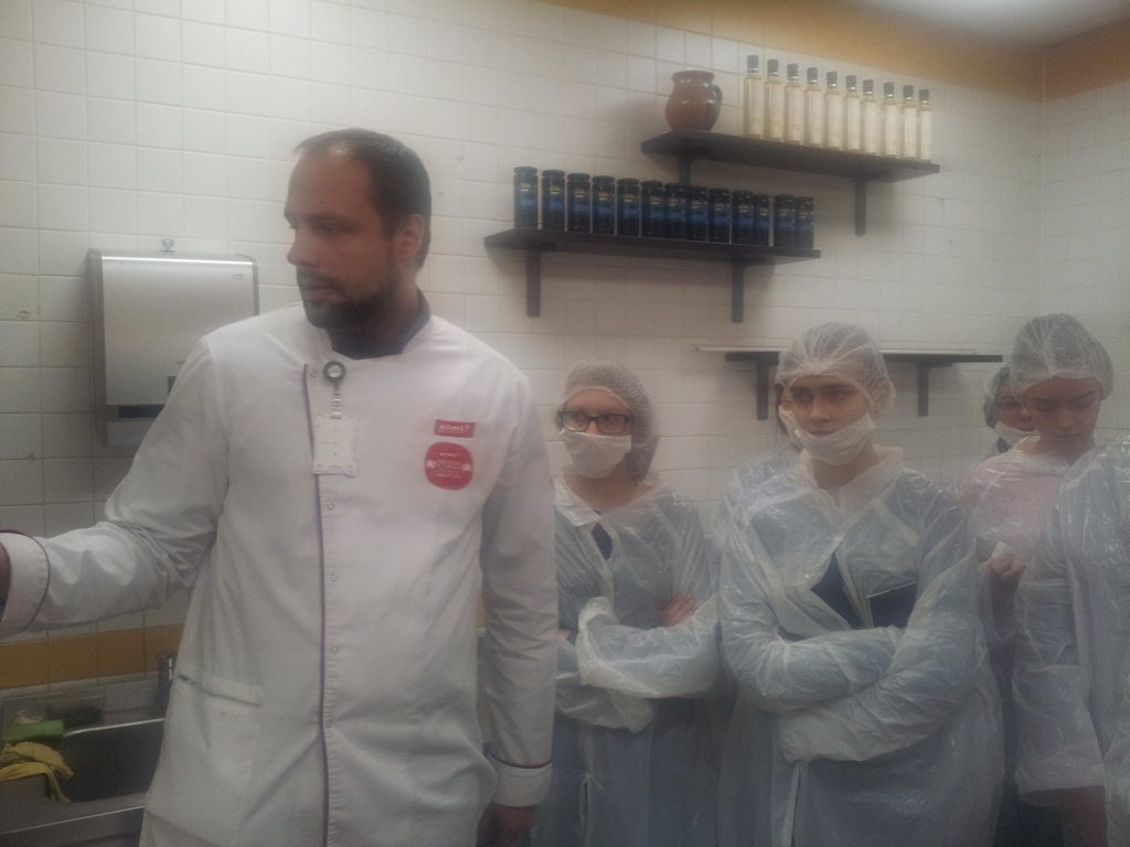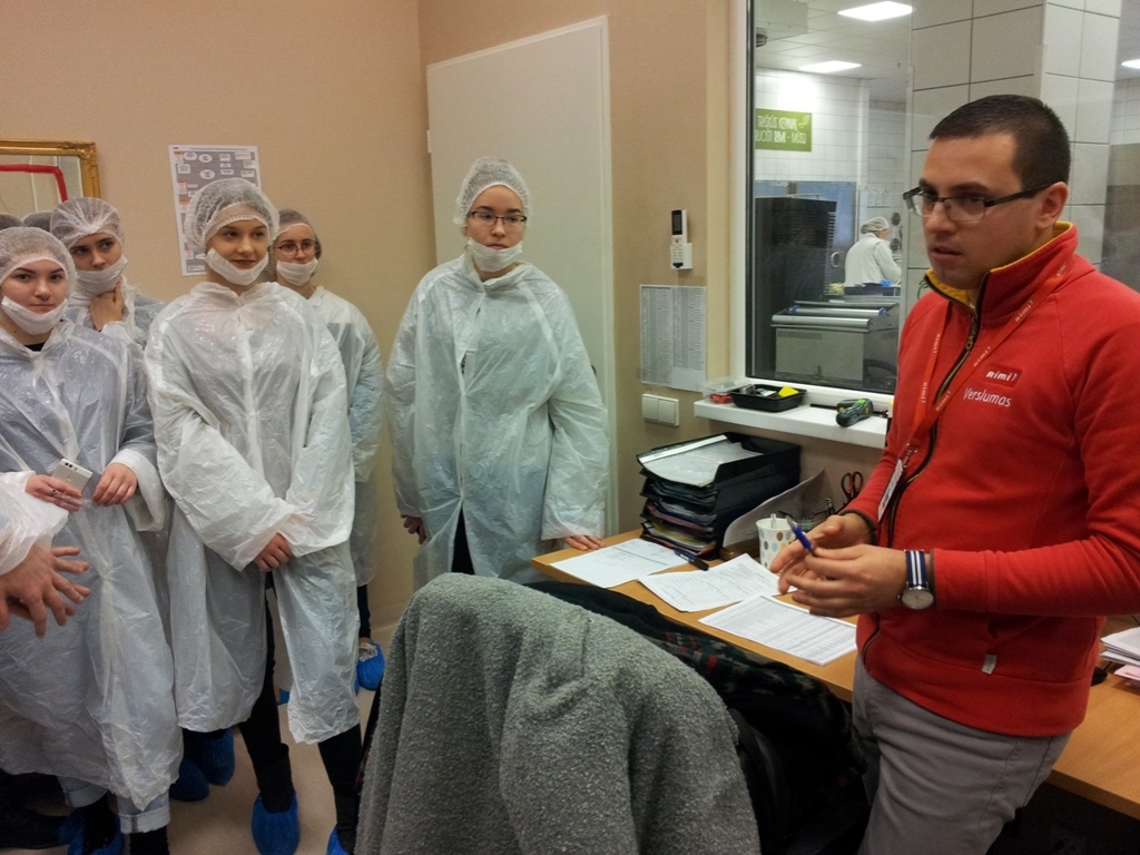 Su įmone, struktūra, veikla MT studentus supažindino įmonės atrankų vadybininkė Evelina Dirmaitė. UAB „Rimi Lietuva“ – tai švedų kapitalo įmonė, kartu yra ir Vilniaus kolegijos Agrotechnologijų fakulteto Maisto technologijos katedros socialinis partneris. Įmonę sudaro maisto gamybos padaliniai: centrinė pagrindinė virtuvė (salotų, suši baras, karštųjų patiekalų, tiek miltinių, tiek mėsos, tiek žuvies gaminių), kurios pagaminta produkcija apie 4 tonos per dieną paskirstoma visai Lietuvai. Džiugu tai, kad šiam padaliniui vadovauja Vitalijus Rimovas – VK ATF Maisto technologijos studijų programos absolventas, kuris drauge su pagrindinės virtuvės technologe Daiva Tomkute mus supažindino su šio padalinio specifika bei maisto gamybos procesu. Pasidalijo savo praktine patirtimi, ko reikia maisto technologijos specialistui, kokių gebėjimų bei įgūdžių. Antrasis aplankytas įmonės padalinys – kepykla. Kepyklos vadovė Virginija Misevičienė papasakojo, kad čia kepama duona, bandelės, pyragai, asortimentas platus – apie 100 pavadinimų įvairių gaminių, kepami jau ir Kūčiukai, ne tik kvietiniai, bet ir ruginių miltų. Pagaminta produkcija tiekiama vietiniam prekybos centrui. Pasivaišinome keksu. Trečiasis padalinys – kulinarijos. Vadovas Saulius Burba paaiškino, kad skyriuje gaminama produkcija plataus asortimento nuo spurgų, miltinių gaminių, vėdarų iki mėsos, žuvies gaminių ir pusgaminių bei realizuojama prekybos centre, t.y. skirta tik parduotuvei. Vyr. mėsininkas Rytis supažindino su mėsinės darbu, paaiškino, kokių atsargumo priemonių, kokių darbo saugos priemonių reikia laikytis darbuotojui, dirbant šiame skyriuje, nes dirbama su elektriniais pjūklais, peiliais, vyksta skerdenų dalijimas, išpjaustymas, malimas, kuteravimas, šviežių dešrelių gamyba. Pagaminta produkcija taip pat realizuojama prekybos centre. Temperatūra žema, atitinkanti maisto saugos ir kokybės reikalavimus. Anot Ryčio – darbuotojai adaptuojasi prie žemos temperatūros ir 200 C atrodo, kad tai Afrika. Išvykos pabaigoje aplankytas penktasis padalinys – konditerijos skyrius. Skyriaus vadovė Alfreda paaiškino, kad čia kepami įvairūs tortai, pyragai, biskvitai ir pyragaičiai. Skyrius savo pagamintą produkciją smaližiams taip pat realizuoja vietoje – prekybos centre.