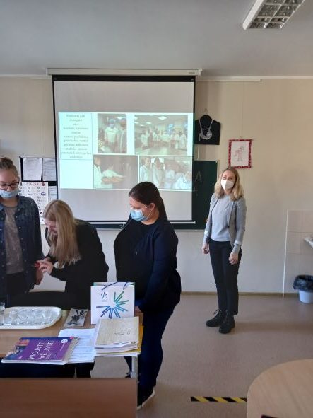 Vasario 28 d. Rūdiškių gimnazijos 11 klasės moksleiviams pamoką vedė Maisto technologijos studijų programos dėstytoja J.Lazdauskienė. Ji supažindino moksleivius su juslinės analizės taikymo sritimis, juslinės analizės skirtumais, lyginant su cheminiais ir mikrobiologiniais tyrimo metodais, taikomais reikalavimais vertintojo (degustatoriaus) darbo vietai. Mokiniai turėjo galimybę praktiškai susipažinti su vienu iš vertintojų (degustatorių) atrankos metodu – skonio jautrumo nustatymu ir nustatė keturis pagrindinius skonius.