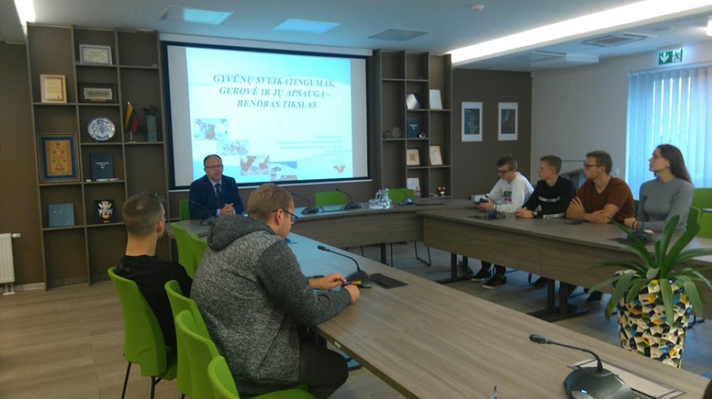 Spalio 4 d. – Pasaulinė Gyvūnų diena. Gyvūnai yra mūsų draugai, pagalbininkai ir šeimos nariai. Jie turi teisę niekada nejausti alkio ir troškulio, nepatogumo, baimės, skausmo ir kančios bei teisę elgtis pagal prigimtinius poreikius. Pagarba gyvūnams turi būti kiekvieno mūsų moralės norma. Šią ypatingą dieną Agroverslo technologijų studijų programos studentai bei lektorė Edita Kristina Kaurynienė lankėsi VMVT Gyvūnų sveikatingumo ir gerovės skyriuje (GSGS). Studentai dalyvavo paskaitoje apie gyvūnų GSGS veiklos aktualijas, sveikų galvijų bandos statusą, ūkinių gyvūnų ligas bei jų sveikatos stiprinimo kryptis. Paskaitą skaitė VMVT gyvūnų sveikatingumo ir gerovės skyriaus patarėjas Giedrius Blekaitis. Studentai diskutavo su tarnybos darbuotojais aktualiais klausimais apie tai, kas ir kaip atlieka gyvulininkystės ūkių patikrinimus, koks VMVT tarnybos vaidmuo, kokie pasitaiko pažeidimai, kokio turinio būna skundai, kaip sprendžiami ūkinių gyvūnų gerovės klausimai, kokių gyvūnų rūšių didžiausios gerovės problemos, ar ūkininkai noriai laikosi gyvūnų gerovės reikalavimų. Studentai domėjosi gyvūnų pardavimo, pirkimo, įvežimo iš trečiųjų šalių į Lietuvą klausimais.