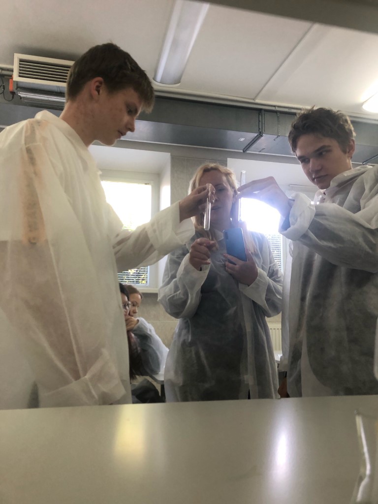 Dėstytoja aptarė alkoholių, karbonilinių junginių ir karboksirūgščių gavimo būdus, savybes, dažniausiai sutinkamų junginių gamtinius šaltinius ir panaudojimą. Chemijos laboratorijoje moksleiviai, vadovaujami laborantės Viktorijos ir dėstytojos, atliko eksperimentinį darbą „Alkoholių, karbonilinių junginių ir karboksirūgščių bei jų darinių fizikinių ir cheminių savybių tyrimas”. Buvo atlikti įvairūs bandymai: stebėta etilo alkoholio reakcija su metaliniu natriu, patikrintos glicerolio rūgštinės savybės, iš būdingo kvapo atpažinta dietilo eteris ir etilacetatas, atlikta „sidabrinio veidrodžio” reakcija, atlikta oksalo rūgšties oksidacija kalio permanganatu, salicilo rūgšties terminis skaidymas, spiritinio muilo tirpalo hidrolizė ir netirpių kalcio muilų susidarymas.