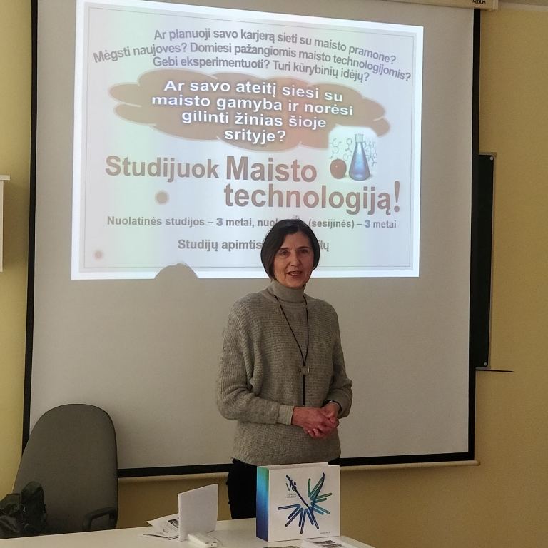Maisto technologijos studijų programos dėstytojai ir studentai 2020-03-12 lankėsi profesinio mokymo centre „Žirmūnai“. Susitikime dalyvavo centro moksleiviai, besimokantys virėjo, konditerio modulines profesinio mokymo programas ir dėstytojai. Buvo pristatyta Vilniaus kolegija, Agrotechnologijų fakultete vykdomos studijų programos (Agroverslo technologijos, Cheminė analizė, Kraštovaizdžio dizainas, Maisto technologija, Veterinarija). Pagrindinis susitikimo tikslas – Maisto technologijos studijų programos viešinimas. MT katedros vedėja Laimutė Milašienė, katedros lektorė Virginija Romanovienė pristatė studijų programos trukmę, studijuojamus modulius, praktikas, karjeros ir įsidarbinimo galimybes, atsakė į pateiktus klausimus dėl dalykų įskaitymo tvarkos stojant į Vilniaus kolegiją ir kita. Savo studijų Agrotechnologijų fakultete patirtimi pasidalijo MT18 grupės studentė Emilija Voišnis, kuri yra baigusi šią profesinę mokyklą.