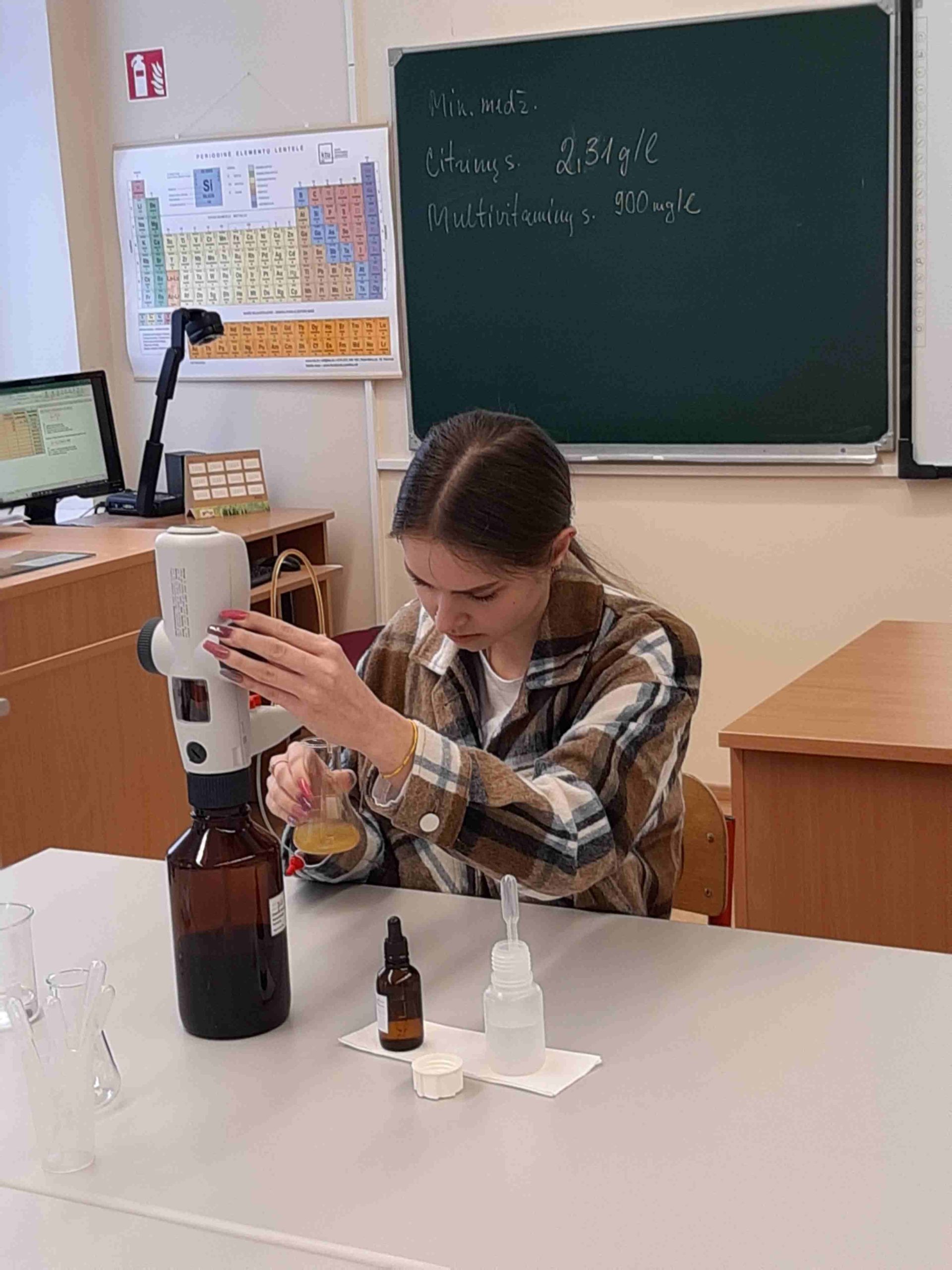 Praktiniame darbe „Ar vaisių sultys yra elektrolitai?“ moksleiviai nagrinėjo elektrolitų savybes, jų funkcijas žmogaus organizme, vaisių sulčių sudėtį, vitamino C savybes ir šaltinius. Įvairių vaisių sultyse moksleiviai konduktometru išmatavo mineralinių medžiagų kiekį, o jodometrijos metodu nustatė vitamino C kiekį bei aptarė tyrimo rezultatus. Moksleiviams talkino Studentų mokslinės draugijos nariai chemikai Gabija ir Emilis.