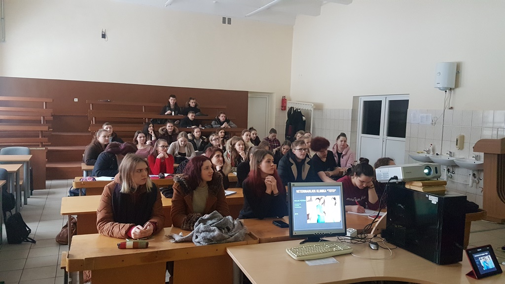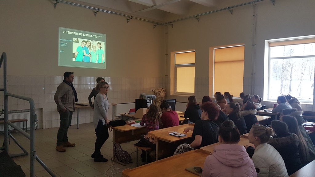 2018 m. vasario 14 d. Veterinarinės medicinos katedroje lankėsi veterinarijos klinikos „TOTO“ atstovai Laura Udraitė ir Orestas Vovk. Norime pasidžiaugti, jog mūsų studentams buvo ne tik pasiūlytos darbo vietos veterinarijos klinikoje, bet ir suteikta galimybė išgirsti įdomią paskaitą apie augintinių odos ligas, bei kardiologijos subtilybes veterinarijos srityje. Veterinarijos gydytoja Laura Udraitė, kurį yra žinoma, kaip viena iš geriausių Lietuvos dermatologių papasakojo kokie tyrimai ir kaip jie atliekami Lietuvoje bei Miuncheno universitetinėje smulkiųjų gyvūnų klinikoje (kurioje pati dirba nuo 2016 m. dermatologijos skyriuje. ), norint nustatyti odos ligas. Studentai sužinojo, jog dauguma odos ligų priežasčių būna neteisingas augintinio racionas, parinkti netinkami pašarai. Studentams buvo paaiškinta, kaip imami mėginiai iš pažeistų odos vietų, taip pat sužinojo, kad kai kuriems sergančių augintinių šeimininkams tyrimų atsakymų tenka laukti ilgesnį laiką, kadangi norint sužinoti tikslius rezultatus, bei problemos sukėlėjus mėginys yra siunčiamas į Vokietijoje esančias laboratorijas. Veterinarijos gydytojas Orestas Vovk, kuris turi daugiau kaip 20 metų patirtį kardiologijos srityje, papasakojo apie augintinių kardiologines problemas. Paaiškino, kodėl svarbu, jog augintinių kūno masė, neperžengtų kritinės ribos, dėl kurios dažnai pasitaiko širdies problemos. Studentai taip pat sužino, jog augintiniams susidūrus su širdies problemomis, kaip ir žmonėms yra taikomas ne tik medikamentinis gydymas, bet ir priskiriamos individualios dietos bei fizinis krūvis, kuris padeda gyvūnėliui netekti svorio, bei tapti fiziškai stipresniu.