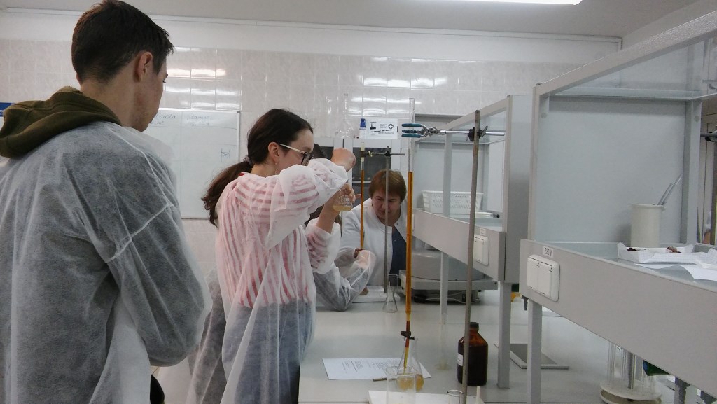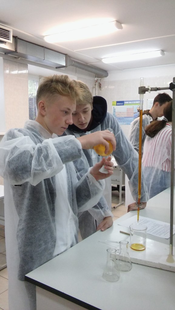 Dėstytoja trumpai apibūdino vitamino C savybes, šaltinius, jo poveikį žmogui, aptarė titrimetrijos metodo esmę, titravimo metodus bei būdus, supažindino su praktikumo „Jodometrija. Vitamino C nustatymas vaisių sultyse” naudojamomis medžiagomis ir aptarė jo eigą. Moksleiviai, susipažinę su darbo metodika, vadovaujami dėstytojų Dalės ir Jolantos bei laborantės Viktorijos obuolių sultyse nustatė vitamino C kiekį ir apskaičiavo bei aptarė rezultatus.