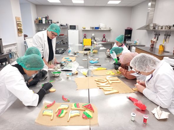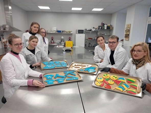Maisto technologijos studentai maisto dizaino praktinių užsiėmimų metu žaidė maistinėmis spalvomis ir mokėsi maisto dekoravimo subtilybių. Taip jie ruošėsi mokyti moksleivius paskaitoje „Pamokos kitaip“, kuri vyks Vilniaus kolegijos atvirų durų dieną. Studentai gamino trapios tešlos kepinius, pasiruošė įvariaspalvius baltyminius glajus, kuriais mokėsi juos dekoruoti.. Maisto dizaino užsiėmimų metu kepiniai virto įvairiaspalvėmis šypsenėlėmis, raidėmis, vėliavėlėmis, marškinėliais… Nors tai nedideli darbeliai, tačiau jie skleidžia šilumą ir džiaugsmą, nuspalvina šią akimirką ryškiomis spalvomis.